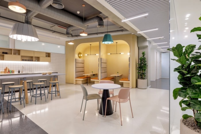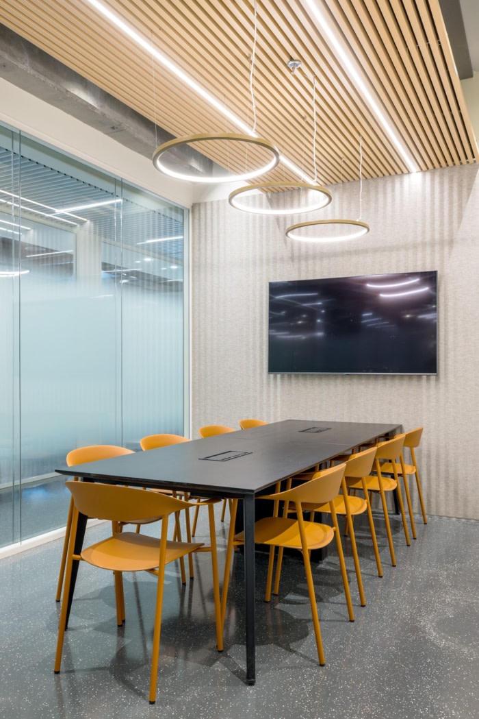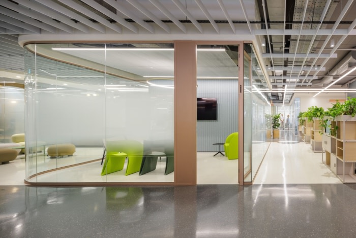 走廊的右边是办公室的入口,打开门后,可以看到一个机器人设计的中央广场和三个焦点室,用作员工可以在更私密的环境中举行小型会议和工作的空间。该区域还规划了小厨房和咖啡角,为了创造差异化并将其定义为繁华的中心,设计师在其上方创造了一个漂浮、通风和吸音网格天花板,内衬吸音织物,因此无论您从哪个角度看,都会绝对清楚这是巨大建筑群的中心。#办公楼设计装修风格#