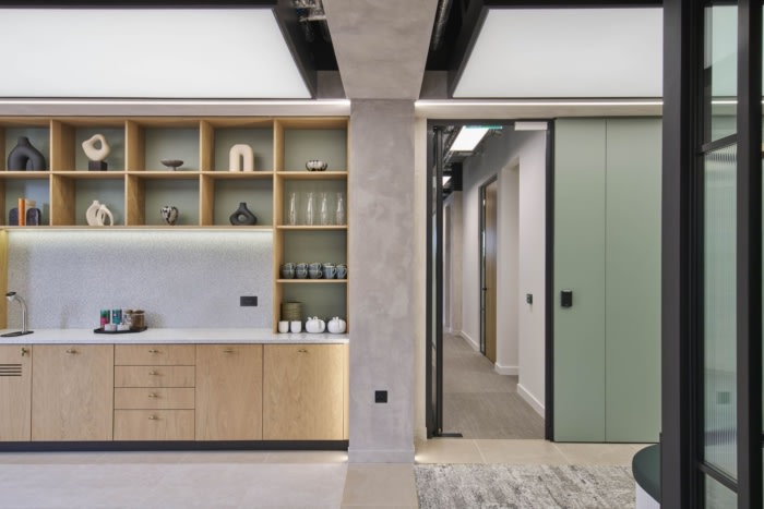 室内设计涵盖了明暗之间的全方位,实现了光线和通风空间以及舒适、温馨的区域的平衡。板条墙经过深思熟虑的整合,允许整个空间的视野,同时保持特定区域的机密性和隐私性。为了增强氛围,灯光被巧妙地放置,以突出室内建筑形式,创造一个视觉上引人注目的环境。办公室周围的落地玻璃可以欣赏到伦敦天际线的全景,为工作和休闲营造出鼓舞人心的氛围?;啡剖铰短ㄎ惫ぬ峁┝舜影旃夷谕庑郎兔谰暗幕?。#办公室室内设计#
