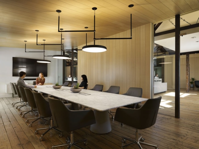 私人办公室以落地玻璃幕墙和木质细节环绕周边,精心调整尺寸以表达空间的现有柱子。利用这些现有的树状结构和散布在中央空间的天窗,该设计创造了一个开放的办公区域,感觉就像森林中的空地。当您进入时,主要焦点是一个多面风化钢雕塑,让人联想到劈开的红木。这座雕塑一直延伸到天窗,既为开放式办公室提供了隐私,又是空间的统一元素。#办公室装修设计公司#