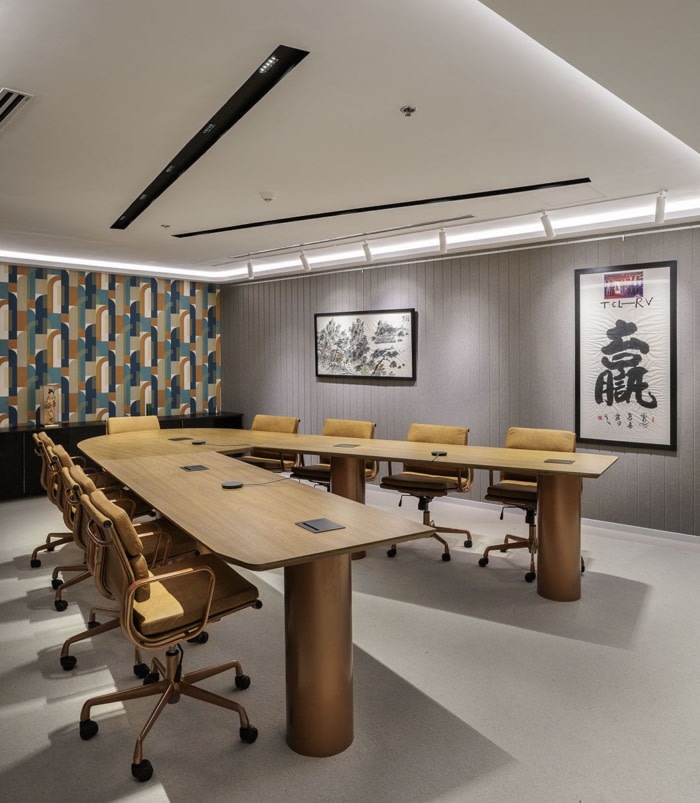 在布局开发过程中,保持运营区域与主要流通路线的私密性是最重要的考虑因素,同时确保动态和引人入胜的流程。为了实现这一目标,MP采用了优雅的弧形走廊,展示了由平面设计工作室专门为客户制作的定制艺术作品。#广州办公室设计公司#