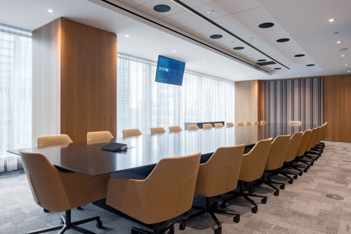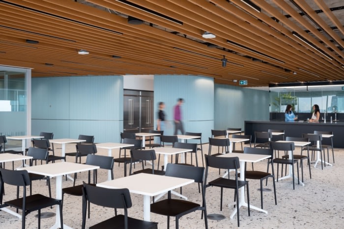 该空间的内部布局包括多功能咖啡厅和工作站的开放区域,旨在通过扁平化等级文化来改变客户的思维方式。它旨在减少私人办公室的数量,并标准化工作空间的形状和大小,以培养平等感和共同身份感。#办公室装修设计#
