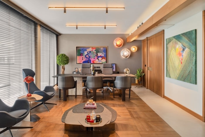 同时体现团队对场地的开放沟通能力,通过在地板上使用玻璃隔板、隔板和不同的材料过渡来设计一个开放的、相互关联的计划。设计师参考了本世纪中叶,以精致的现代性诠释了它,并精心挑选了艺术品和物品。#办公楼装修设计风格#