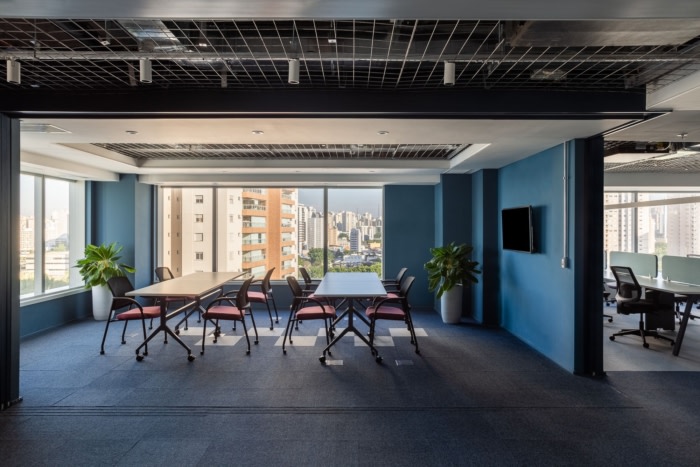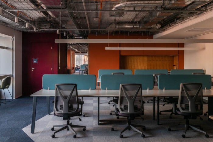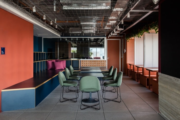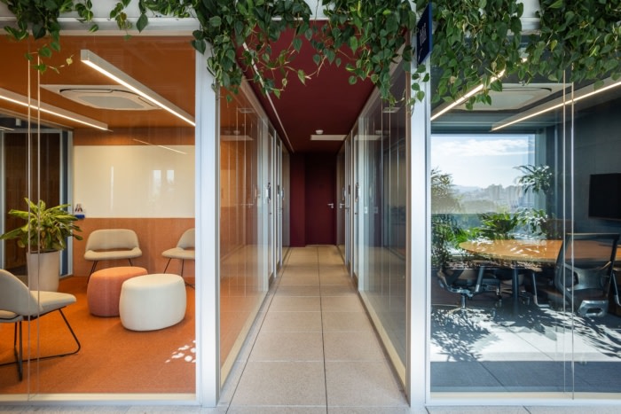 生态砖在铺设前会旋转,并添加软木塞以形成隔音元素。它们和其他砖块以非常规方式铺设,没有皱巴巴;通常用于楼板混凝土浇筑的流行金属网用于具有明显安装的衬里;混凝土,通常是结构元素,用于工作柜台和接待处,景观美化与建筑材料形成鲜明对比。沿着周边,藏匿罐填满了天花板,在通往会议室的走廊上,阳光最多的地方之一,花坛的“隧道”过滤了光线,充当了天然的遮阳伞。#办公室设计装修公司#