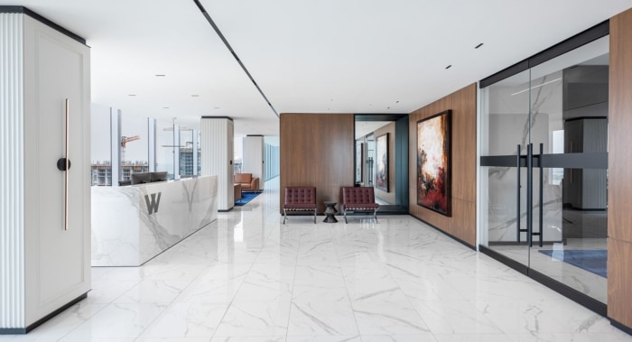 当您离开电梯大厅进入接待区时,令人惊叹的远景成为设计的壮丽焦点。在整个空间中,温暖的木材和诱人的材料营造出独特的精致和永恒感,整体上给人一种温馨的感觉。简洁的建筑调色板旨在唤起 企业的文化和值得信赖的声誉,颂扬天然材料,强调线性细节、单色分层和丰富的口音。#办公室装修设计#