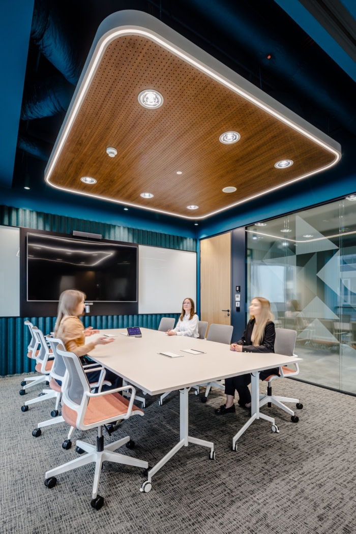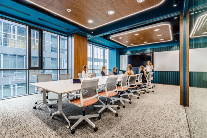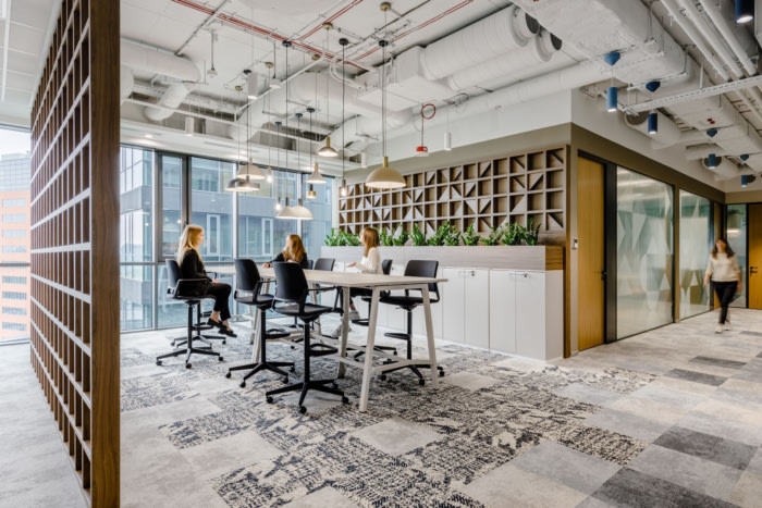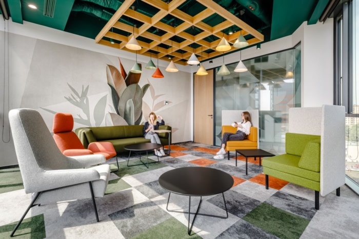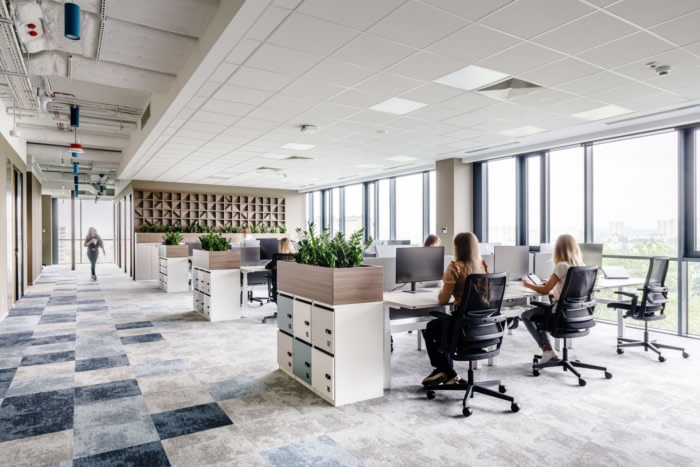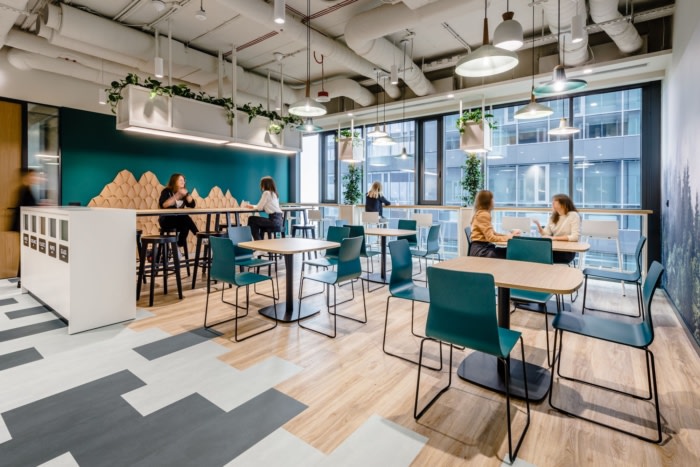 在新办公室的布置中,专家们专注于受大自然启发的色彩和材料——主要颜色是中性色调,如米色、灰色,结合绿色和蓝色,并被木材和软木等材料的温暖点缀所抵消。在社交空间(即休闲区、厨房、咖啡点)中,带有花卉图案的壁纸为员工提供了休息和放松的支持。#公司办公室装修#