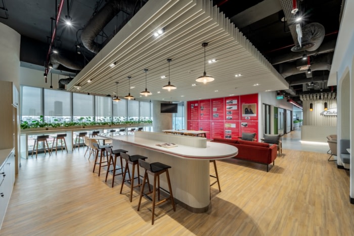 为了促进互动,空间被最大化,以满足社交空间和协作区域的需求??烧鄣舳峡勺魑喙δ芸占涓舭?,使会议区域能够扩展,以容纳更大的聚会。这种灵活的空间解决方案有助于整体美感,同时促进工作空间的高效和多用途使用,体现了强调简约性和功能性的日本风格。在不偏离概念的情况下,在沙发、天花板照明和办公桌上都可以看到公司的色彩,为办公室的每个角落增添一丝身份感。#广州知名办公室设计公司#