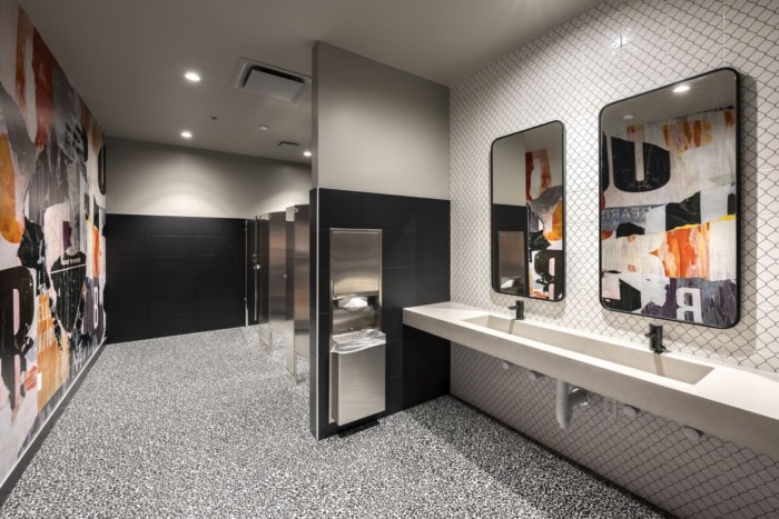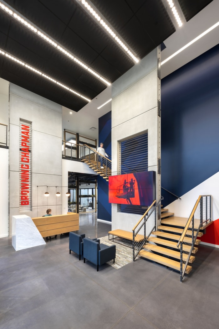 该团队始终采用三维方法进行设计,开辟了一个 2 层楼的空间,作为必要私人办公室周边协作的核心。抵达后,预制混凝土板将员工和客人邀请到一个高耸、充满活力的空间。大堂两侧是一个支持空间的生态系统,包括会议室、培训室、协作中心和健身中心。定制的木材和钢制隔断用于在视觉上划分开放式办公空间,并将一楼与二楼连接起来。#南沙办公室装修#