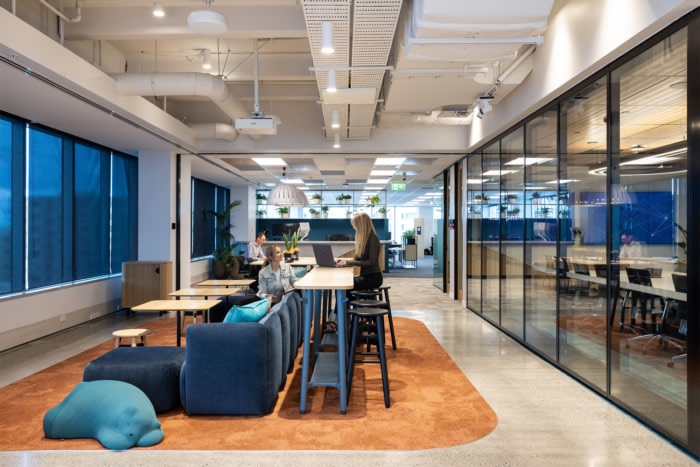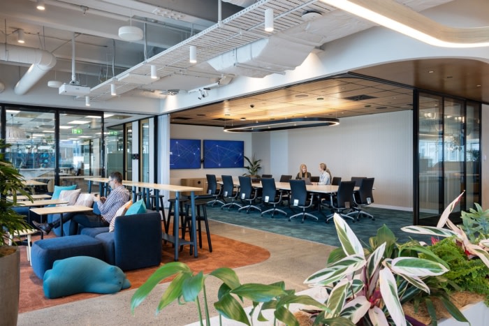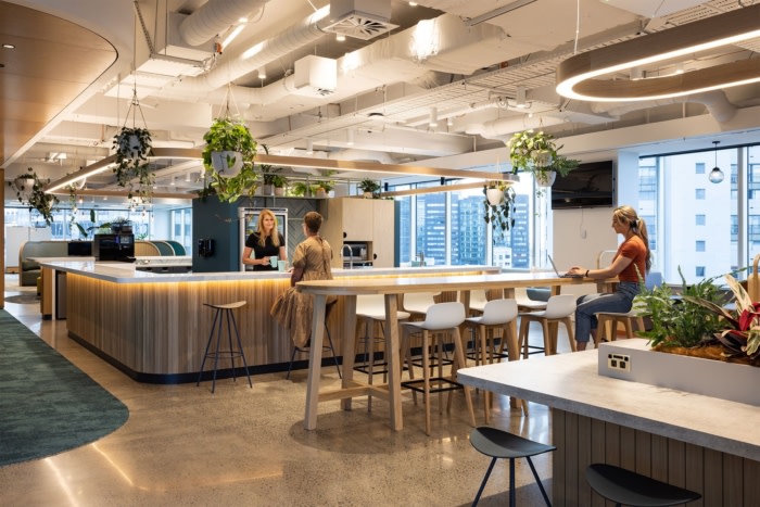 灵感来自自然环境——一个让我们放松和充电的地方。在我们的自然环境中,有一个地方是标志性的海滨别墅,它启发了空间将外部和内部、海滩与山脉联系起来。该楼板专用于大型多用途到达/连接/社交/会议空间。该租约的主入口通过视觉上开放的定制木格子墙和无框玻璃入口门邀请您进入这个西部区域。这确保了为游客提供轻松而诱人的抵达体验,同时仍然遵守 企业的多级安全要求。#时尚办公室装修设计风格#