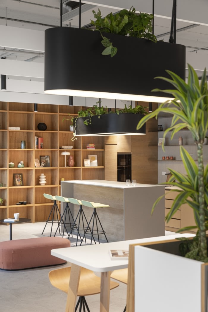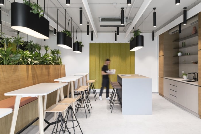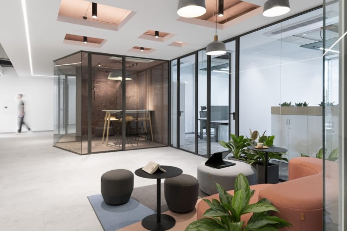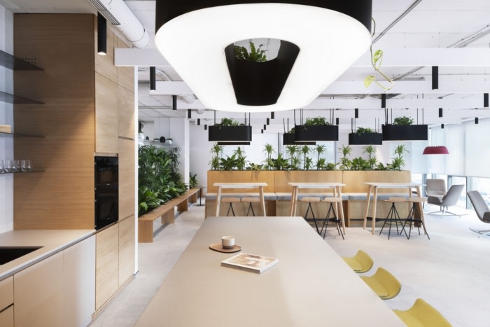 整个办公空间郁郁葱葱的自然绿地的完整性基于亲自然设计方法的原则。在工作区,绿化紧挨着工作站,合作点被较大的植物略微遮蔽,而厨房和社交区则完全被各种绿色植物所压制。因此,由于小气候和自然环境的改善,人们的生产力更高、更平衡、更满意。#独栋办公楼设计装修#