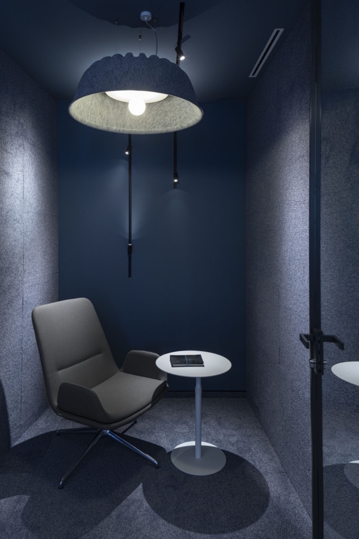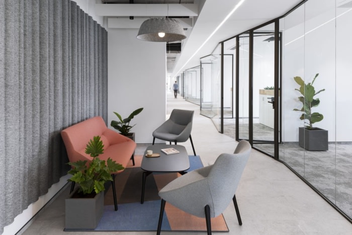 白色的墙壁与微妙、柔和的绿色、蓝色和粉红色调相结合,有助于营造出不同区域的整体舒适感和平静感。调色板及其用法遵循空间的一般概念,强调办公室中性格的逐渐变化。从工作区域极少使用非常微妙的色彩开始,结合原材料和临床简约的外观,成为公司DNA的一部分,并略微发展为更加丰富多彩和“柔和”的协作区域。#公司办公楼设计装修#