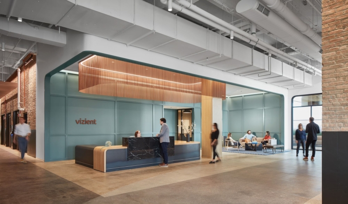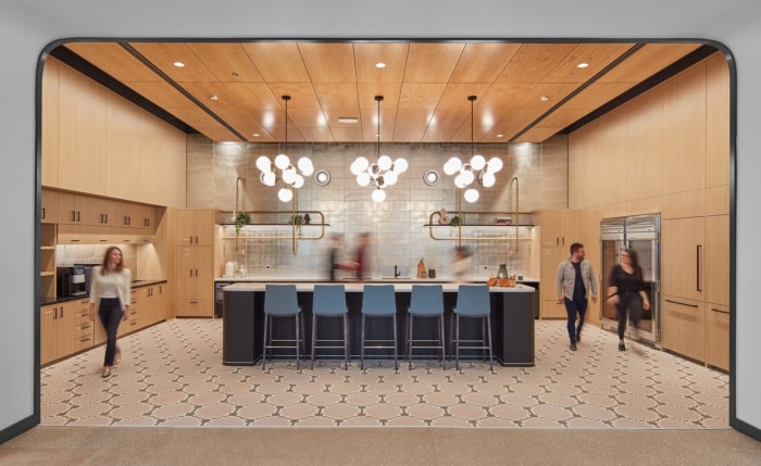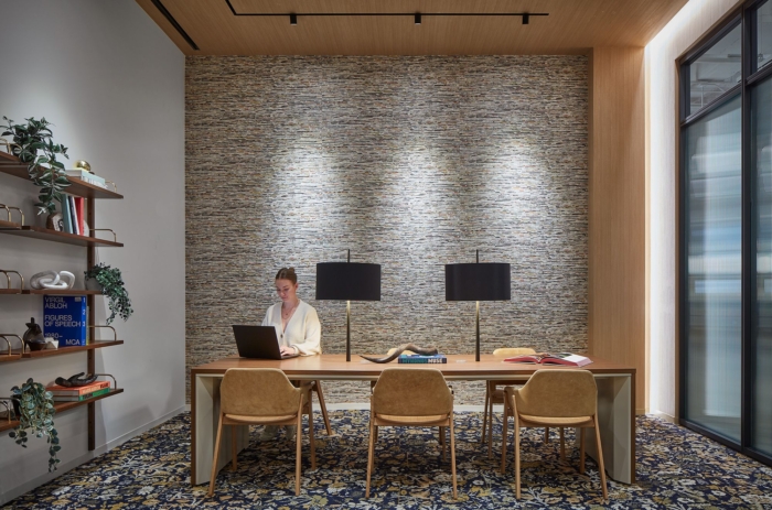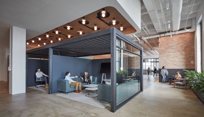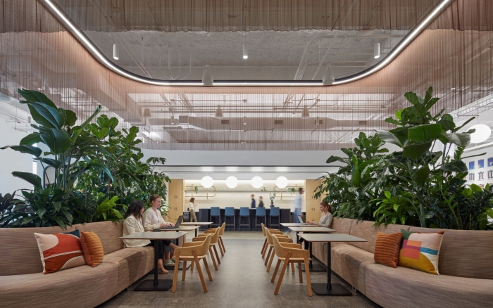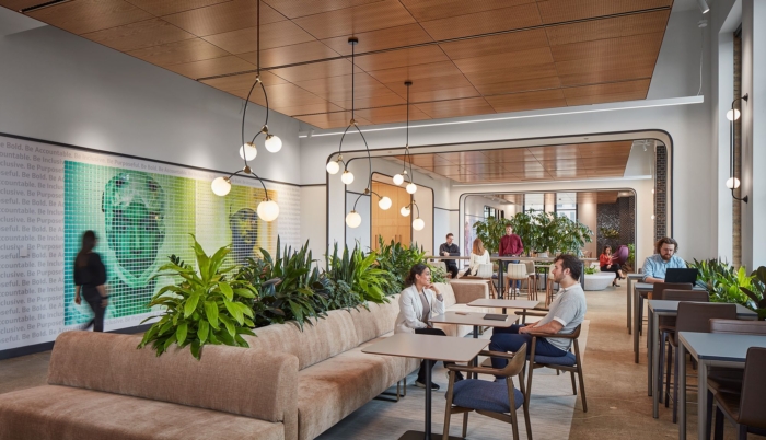 办公室装修设计采用旧邮局的建筑风格,利用大天花板高度在整个空间中创造了各种独特的建筑体量。这些体量覆盖在一系列建筑饰面上,为广阔的空间提供了平易近人、人性化的规模。此外,将自然光引入空间,并在整个空间中提供多个广阔的绿色植物区域,为大地板带来温暖和舒适的感觉。