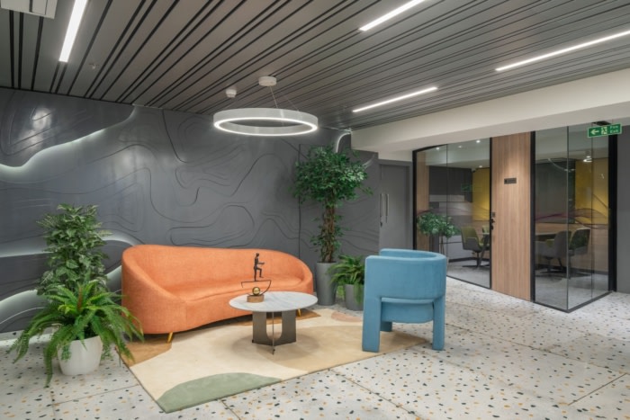 咖啡馆被设计成带顶棚的大露台。水泥灰色瓷砖地板与水磨石桌面相得益彰,并增强了空间的绿色。用陶土包覆的砖块为空间增添了温暖。定制设计的墙纸是这个房间的亮点,为空间增添了活力。该空间还装饰着悬挂植物和盆栽植物,为办公室增添了绿色植物。咖啡馆旨在成为员工休息、充电和与同事社交的地方。#办公室装修公司排名#