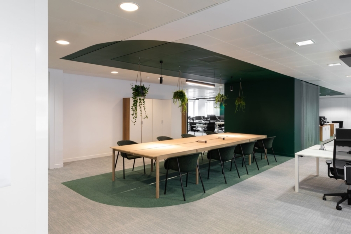 为了秉承企业对环境可持续发展的承诺,设计团队利用创新、经济高效和环保的材料,以及郁郁葱葱的绿色植物,营造出宁静的氛围。厨房区成为放松和恢复活力的中心,为员工提供了在休息时间放松、社交以及参加非正式会议和活动的空间。#公司办公室设计装修#