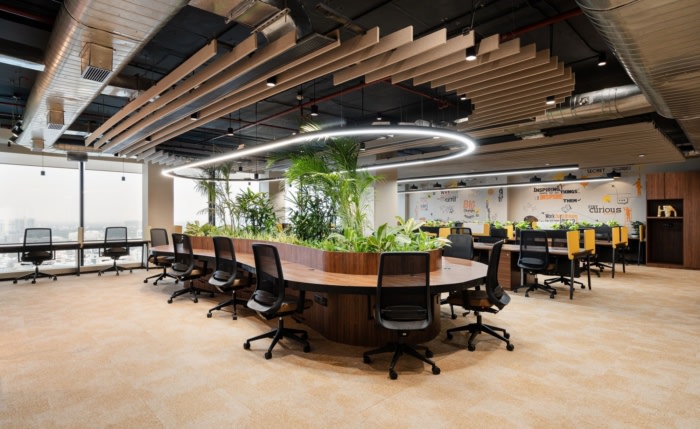 右翼是整个项目的核心,其标志性建筑——巨大的弧形工作站备受瞩目。其核心是令人印象深刻的树叶,是活力和灵感的充满活力的象征。这款弧形中心装饰品超越了平凡,吸引着任何进入空间的人。在它上面,天花板设计和照明优雅地遵循工作站的轮廓,突出了其起伏的形状。除了这个焦点之外,与HNI合作定制设计的一系列办公桌提供了量身定制的工作空间,并辅以横跨后墙的励志壁画。阳光明媚的黄色隔板和精心布置的植物将功能与美学相结合,营造出自然光充足的环境。该区域代表了协作和创新的核心,体现了工作空间设计理念的精髓。#办公室装修设计公司哪家强#
