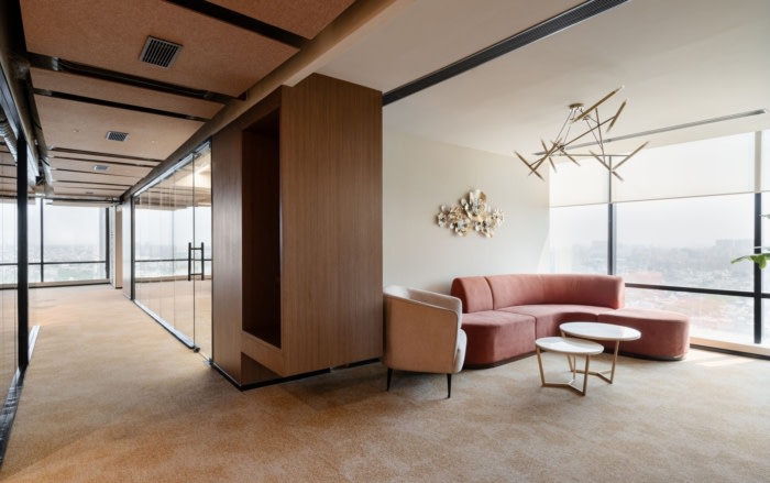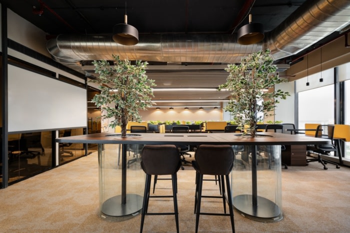 工作空间强调开放式概念区域和充足的自然光线,散发出积极向上的气息。以赭石色和橘色为特色的充满活力的调色板与以柔和的米色和棕色为主的色调相得益彰,营造出令人振奋的氛围。亲自然的设计原则贯穿始终,郁郁葱葱的盆栽植物营造出宁静的感觉。#办公室装修设计公司#