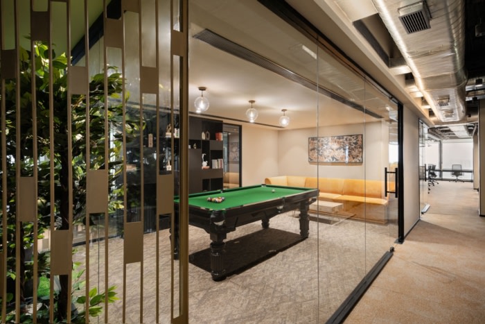 布局无缝地引导游客穿过中央门厅,弧形大理石接待台矗立在线性金色金属屏风前。屏风后面是温馨的休闲休息室,在绿树成荫中提供私密空间。一段旅程通过“故事墙”展开,展示客户的历史。工作空间分为两翼,每个翼楼都提供独特的体验。#办公室装修设计公司排名#
