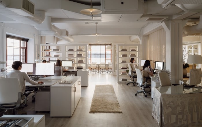 开放式办公室以白色调呈现,支持其和平氛围以及展示艺术、家具和创作过程的能力。长方形空间的尽头是会议室和图书馆,可欣赏到埃利奥特湾和奥林匹克山脉的景色。#办公室设计装修风格#