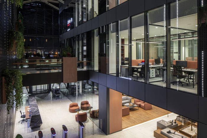 当务之急是欢迎来自国内和国际各地的知名客人,这通过令人印象深刻的入口表现出来。三层高的入口区域通过两座桥梁连接管理和生产大楼。这些桥梁区域还用作社交空间,为员工提供对周围环境的不同视角。#企业办公楼装修风格#