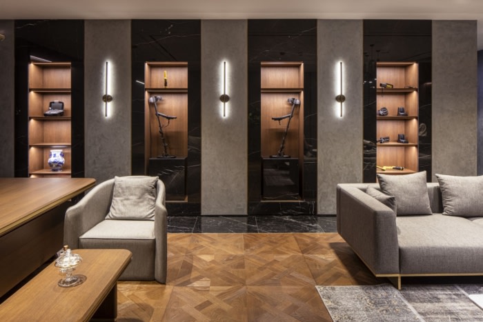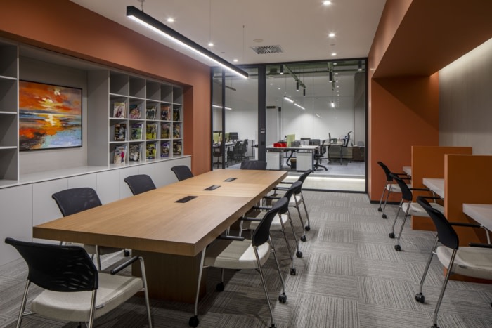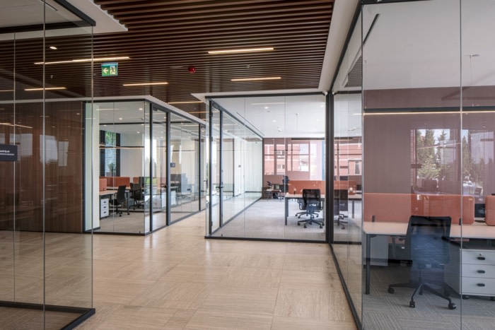 以标志性的大理石接待台和引人注目的灯光设计欢迎员工和客人,并设有VIP休息区,提供舒适愉快的谈话空间。办公空间的设计高度最大,集成了所有电气和机械系统,以确保尽可能吸收自然光,甚至延伸到走廊区域。在办公室设计中,简约性是优先考虑的,即使在分隔部门时,也利用玻璃隔断来保持视觉连续性。木材的温暖融入了所有材料中使用的白色和鲑鱼色调。#企业办公楼装修设计#