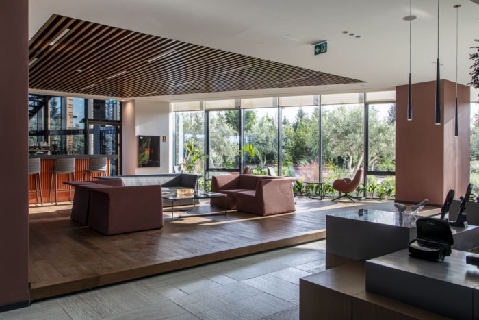 企业办公楼设装修设计:木材的温暖融入了所有材料中使用的白色和鲑鱼色调