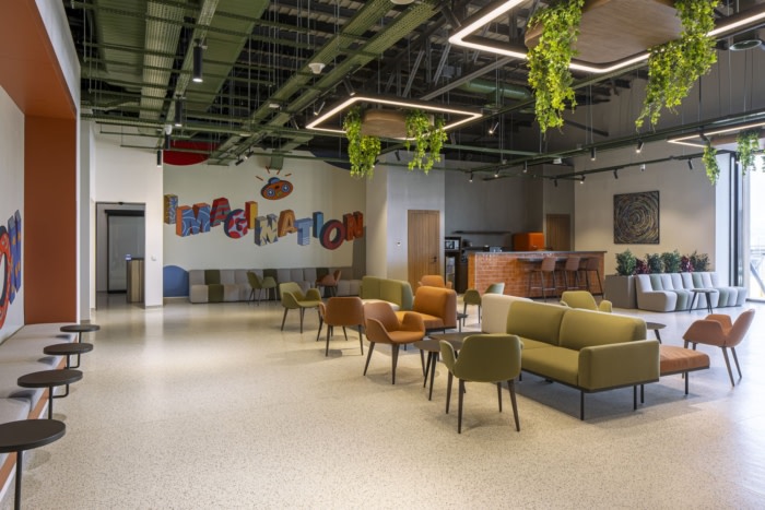 由于建筑的结构,在穿过一个动态和标志性的入口区域后,管理和生产区域在空间上是分开的。在管理领域,采用柔和色彩的极简主义设计方法,而生产和研发领域则采用以鲜艳色彩为特色的动态设计语言。#企业办公楼装修#