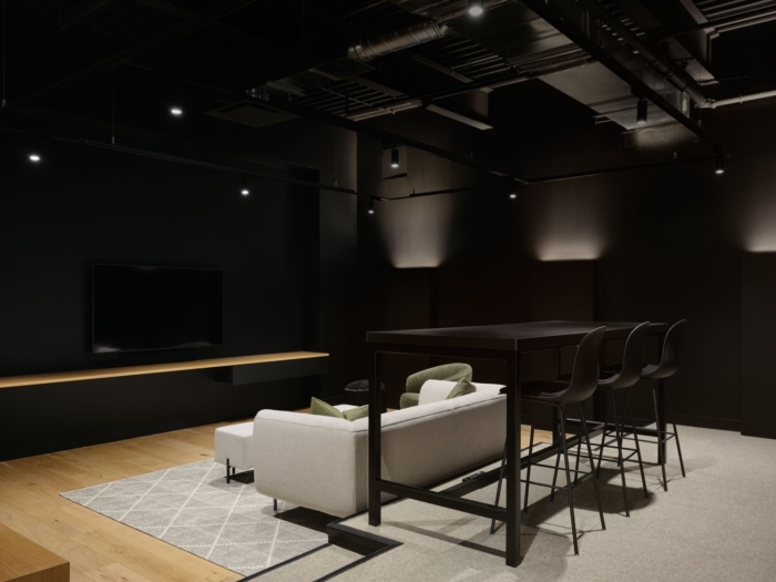 这个空间的标志性设计元素包括艺术家制作的悬挂云朵,它们与公司的标志相呼应,创造了一个强大而一致的视觉形象。楼梯也被改造成休息、工作或聚会的空间。接待台是一件真正的艺术品,灵感来自冰山,与天美的吉祥物企鹅有关。这在您一进入办公室时就会产生令人惊叹的因素。游戏休息区是一个大胆的房间,配有住宅家具和黑色油漆,营造出亲密、舒适的地下室氛围,就像他们视频游戏的未来用户一样。最后,将集装箱改造成带有玻璃隔断的原始会议室,体现了公司原创的创新设计。所有这些元素都为空间的居住者创造了难忘的体验。#办公室装修设计公司广州#
