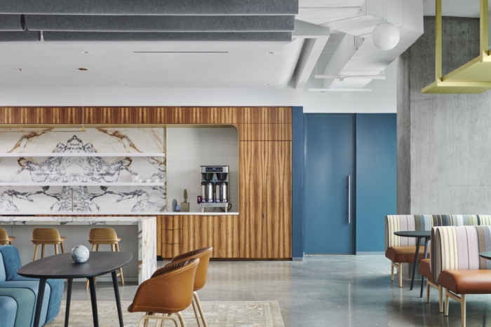 功能性和辅助性工作区以及休息空间不仅提高了工作效率,还鼓励了放松和社交的时刻。工作站被划分为多个社区进行协作,浮动天花板平面为开放式办公区域提供了良好的声学效果,让人感觉专业但不公司化。植物和当地艺术品贯穿始终,突出了增长的重要性,微妙地向奥斯汀美学和与创意社区的联系致敬。#办公室空间设计公司#