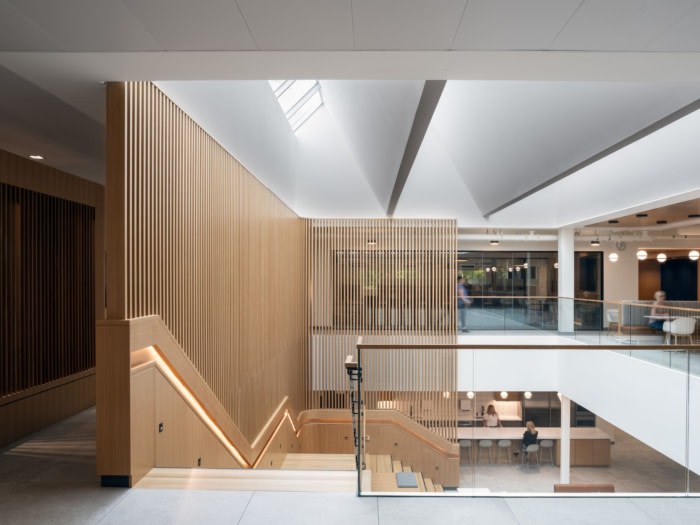 在整个空间中,调色板是内敛的。温暖的白橡木和对比鲜明的深灰色与清爽的白色表面相得益彰。蓝色、橙色和绿色的有机色调被谨慎使用,与简单的调色板形成对比。白橡木和深灰色的垂直木板条提供了一种质感体验,有助于缩小空间的规模。圆角和其他细节柔化了建筑的现代线条。#公司办公楼装修#