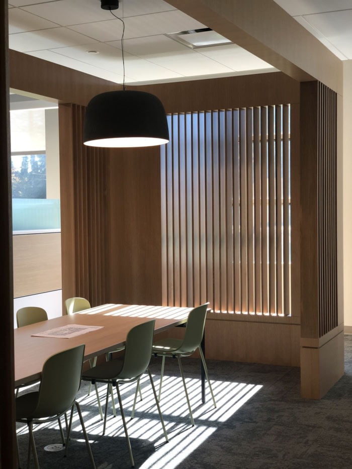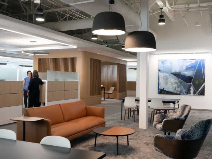 公司办公楼装修:蓝色、橙色和绿色的有机色调被谨慎使用,与简单的调色板形成对比