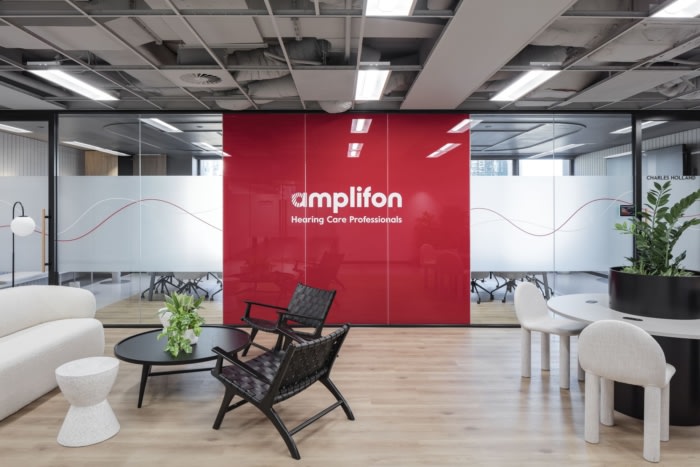 定制标牌被战略性地放置,以反映公司的价值观和文化。这些微妙但有影响力的细节旨在引起员工和访客的共鸣,在企业内部创造一种归属感。充满活力的“Amplifon red”流行元素在整个空间中以令人惊讶的元素使用;小心使用,以免决定调色板。从地毯到家具和装饰墙,每个元素都经过精心挑选,以反映企业品牌。这种和谐的配色方案在营造视觉冲击力和一致的氛围方面发挥了关键作用,强调了品牌的精髓。#公司办公室装修#