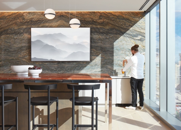 独一无二的手工材料营造出独特的丹佛氛围,纹理和照明使设计更加完美。纹理面板框住了接待区的长椅。织物包裹的面板从另一侧接待墙的整个石材体量中勾勒出共用休息室的长椅。共用休息室提供杂色落地玻璃隔板,以?;ひ?。手工制作的墙纸线条在一系列灵活的会议室之间旋转门,将科罗拉多山脉的柔和抽象带入空间。#广州办公室设计装修公司#