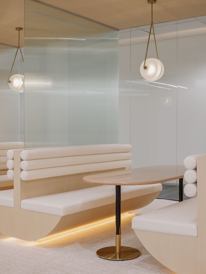 材料调色板以浅色调、纹理表面和自然中性色为特色,前台和门廊等蓝色点缀反映了公司的身份?;ㄔ翱Х裙莸目攀教旎ò宄氏殖鋈岷偷纳汉魃?,并配有触感柔软的浅灰色编织纹理地板。这种耐用的编织地板适合在多功能空间中高流量使用,其中还包括一个湿储藏室。会议室的室内设计通过粉色和蓝色的吸音墙板呈现出各种配色方案。一般工作区使用地毯,浅灰色地毯标明主要流通路线,米色地毯标明工作区。#广州专业办公室装修公司#