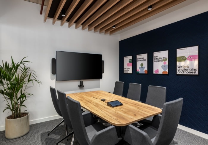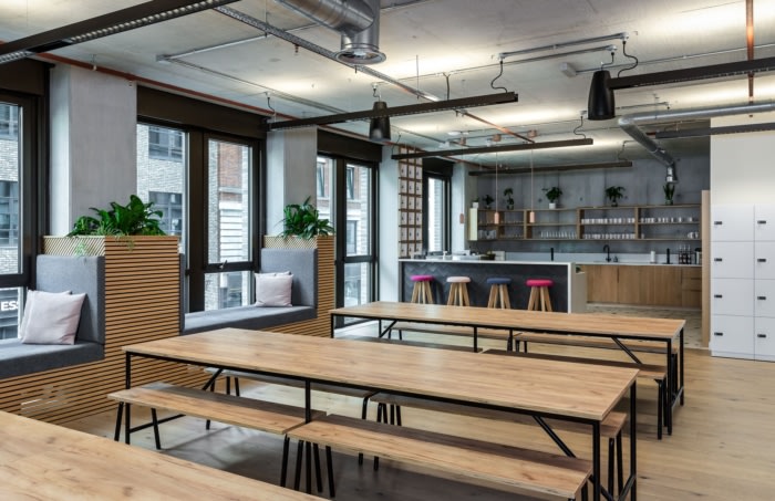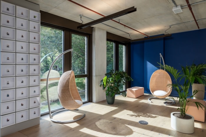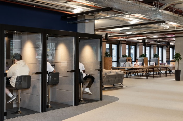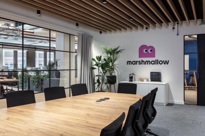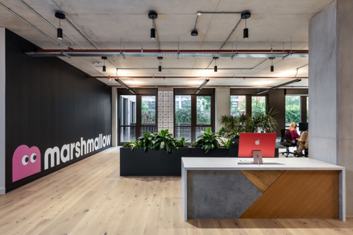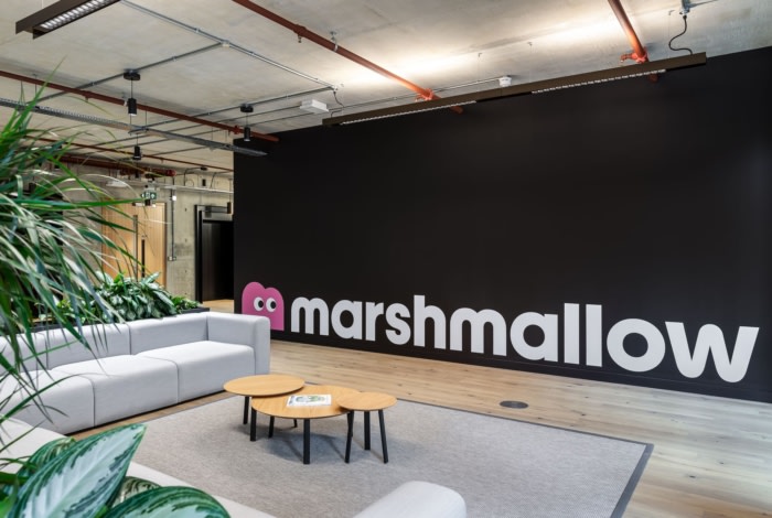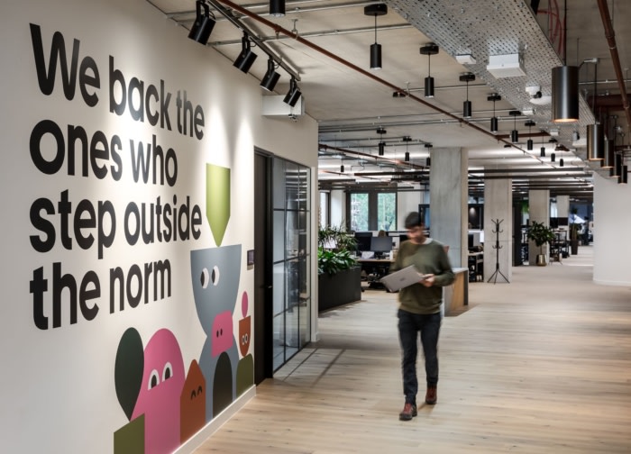 设计选择偏离传统的饰面,采用现代和自然的材料调色板。精心策划的纹理组合,包括软木、裸露的混凝土和木材等元素,以及吸音板和天花板筏上精心挑选的饰面,共同营造出一个诱人的触觉环境。他们标志性的粉红色和带有人物图画的品牌墙巧妙地使用,创造了一个明显的棉花糖空间。#办公空间设计公司#