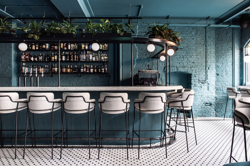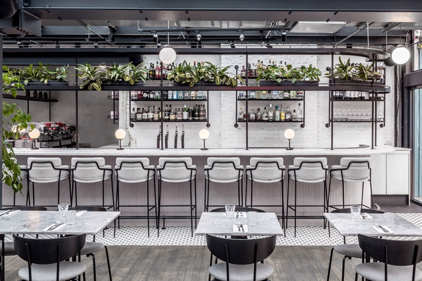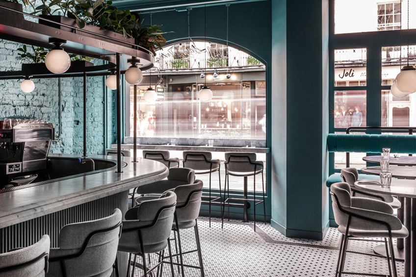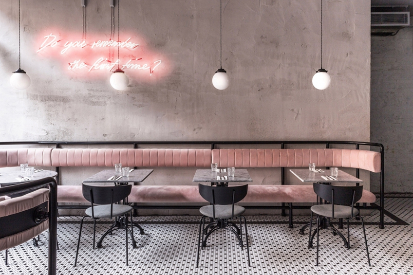 加了新的框架和家具,但是旧砖墙被大面积保存下来,通过不同的颜色来给它注入新生命。餐厅主要分三个区域:熟食/外卖区、鸡尾酒吧、用餐区,这三个空间的风格和颜色并不相同,外卖区是可爱的粉红色,而酒吧以绿色为背景。