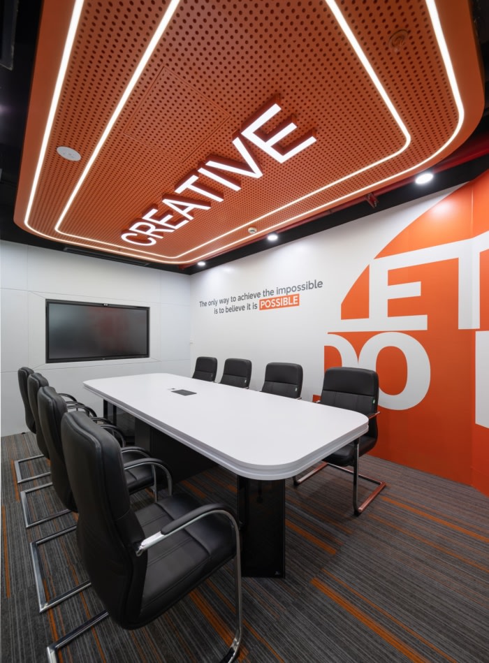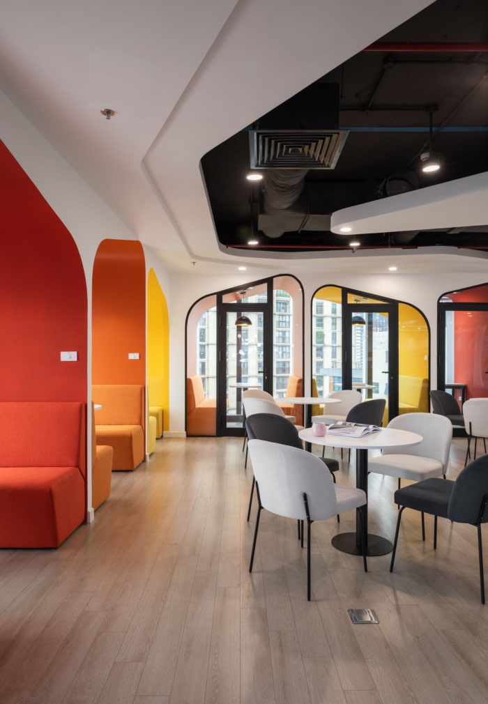 橙色和黄色既充满活力又引人注目,非常适合给人留下深刻的印象。为了在进入空间时营造出平衡和愉快的氛围,设计简化了形状和线条的使用。从火山喷发的强大形象中汲取灵感,通过使用轮廓线在设计中融入了巨大的熔岩流。该元素主要体现在办公室的多功能区域。#广州办公室装修#