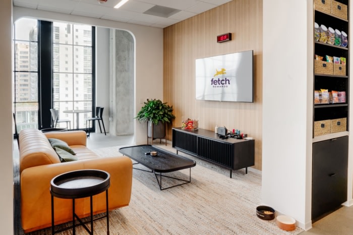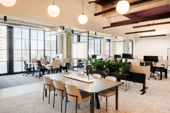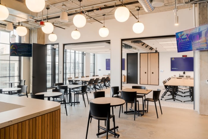 突出的设计元素包括接待台后面的定制开槽特色墙,在不影响落地窗自然光的情况下提供隐私,以及醒目的墙纸,呼应企业的创新和表现精神。车库门和可操作的隔板优化了全员会议的空间,而高端休息区和游戏室则鼓励员工互动。#办公室装修设计方案#