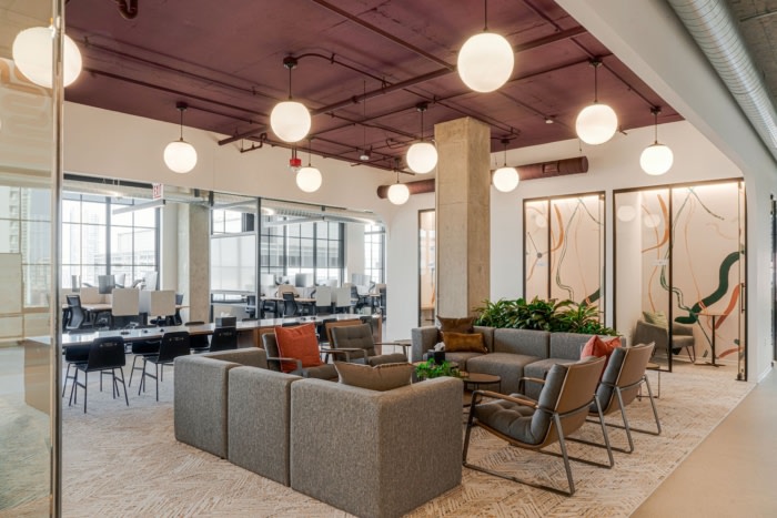 设计理念的重点是打造一个充满活力和高效的工作空间,以反映企业的品牌和文化。它拥有各种协作区、充足的自然光线和战略定位的社交中心。该设计采用大胆多彩的调色板,融合了工业元素,与建筑无缝融合。#办公室装修设计#