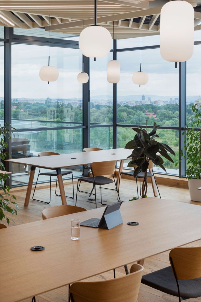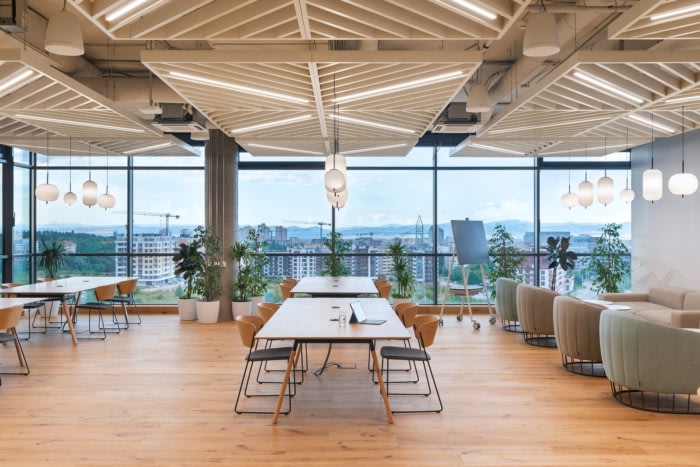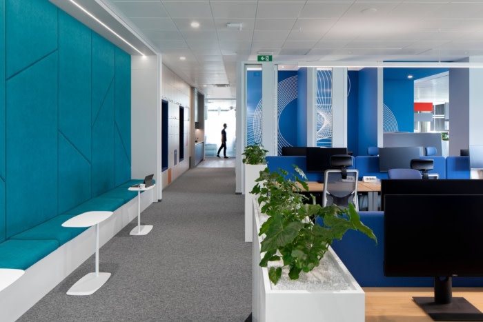 设计的核心是受企业品牌启发的强烈图形元素,并由建筑师巧妙地重新诠释。这些元素表现为流动、起伏的形式,贯穿整个空间,在各种功能中作为统一的视觉主题。此外,色彩点缀的策略性使用进一步勾勒出不同的区域,从接待区和会议区的正式优雅到协作空间的活力。同时,放松和灵活的工作区提供了一个宁静的休憩之所,培养了创造力和幸福感。#办公空间设计公司#