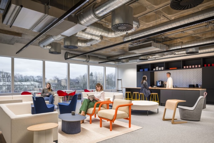进入办公室后,人们穿过一条黑墙走廊,通向一个轻松的触地空间,里面摆满了休闲家具和咖啡桌,两侧是俯瞰大楼周围树梢的巨大窗户。#办公室设计装修公司#