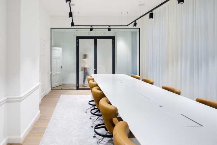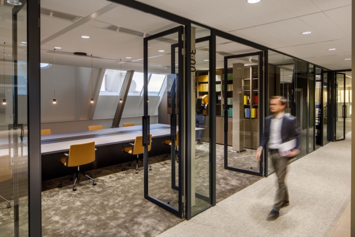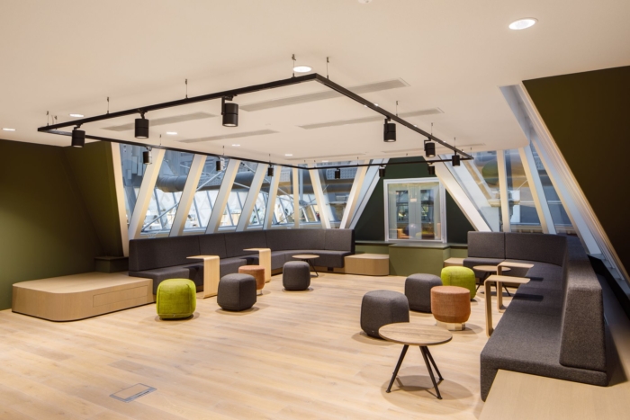 中庭的建筑元素设计松散地参考了新文艺复兴时期的室内立面。通过应用明显的色彩平面,具有原始细节的时代房间被改造成现代办公环境;历史悠久的赭石色调的飞机在装饰华丽的走廊中标记出新的走廊。顶层拥有原始的木椽子,没有隔断,并被组织在不同的“家庭区”中。#总部办公楼设计装修#