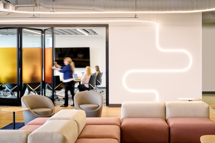 在开放式办公室中,促进员工之间的联系和创新。在关键活动区域提供流行色彩和个性的灯具,同时保持其他饰面和灯具的中性和精致性,使该客户在协作和专注之间取得理想的平衡。整个聚会空间都聚焦在窗户上,突出并构筑了附近足球场和远处山丘的令人难以置信的独特景色,从而为员工和客人提供了一个引人注目的动态空间。#办公室装修设计方案#