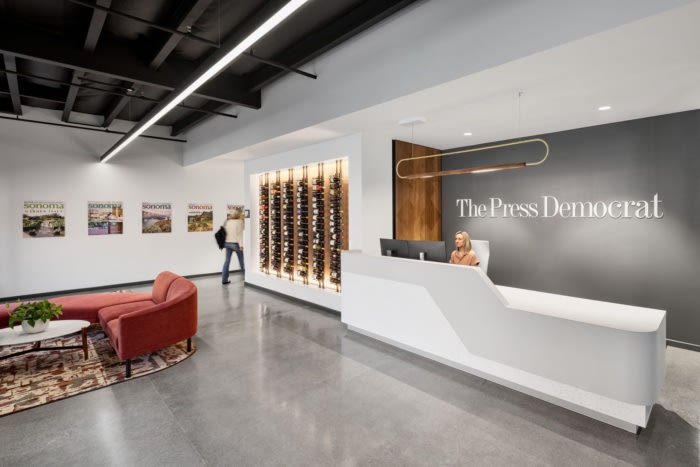 大堂和相邻空间的关键时刻旨在反映出版物的旅程。首先是葡萄酒墙,突出了该报对索诺玛葡萄酒之乡的报道。一盏微妙的LED灯“故事情节”引导访客穿过各个工作区,最终到达休息室。这种独特的照明元素为导游照亮了一条道路。#办公室装修设计公司#