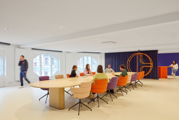 在开放的公共区域,一个浅蓝色的椭圆形长凳沿着前女士游泳池的轮廓排列。它作为一个多功能的交汇点,可以用作内部的长凳和外部的柜台。周围的落地窗令人印象深刻地强调了裸露的瓷砖。#专业办公室装修设计#