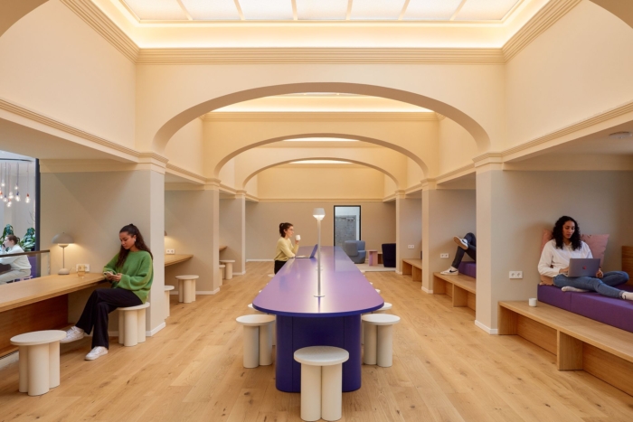 水疗中心的前休闲室也保留了其功能,但已适应现代数字工作的需求。沐浴者曾经在长凳上休息,现在在细长的分段拱门之间有定制的壁龛。面向大厅的工作壁龛和一张超过八米长的桌子使房间具有图书馆般的特征——适合安静或较小的小组工作。天然材料表面和间接光线营造出温暖、舒适的氛围。#网红办公室装修设计#