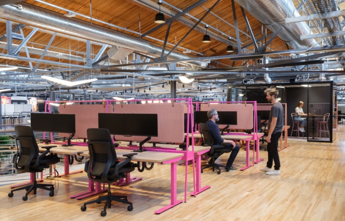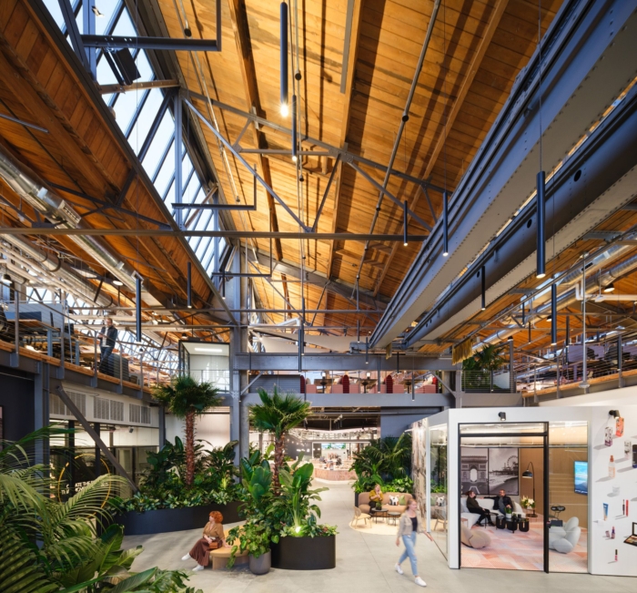 饰面、图形(包括外部标牌)和风格选择(如调色板和家具)以及精心策划的艺术有助于产生变革性效果。健康和工作与生活的平衡是重中之重,并通过深思熟虑和宁静的元素融入其中,如城市花园、昂贵的亲生物植物、“吠叫地”(供团队毛茸茸的朋友使用)、健康和健身室、室内外工作空间和充足的自然光线。楼梯和走道在楼层和区域之间形成物理连接,但也提供了内部地形,使人们能够爬上去调查更大的空间、其组成部分和在那里工作的人。#公司办公楼装修方案#