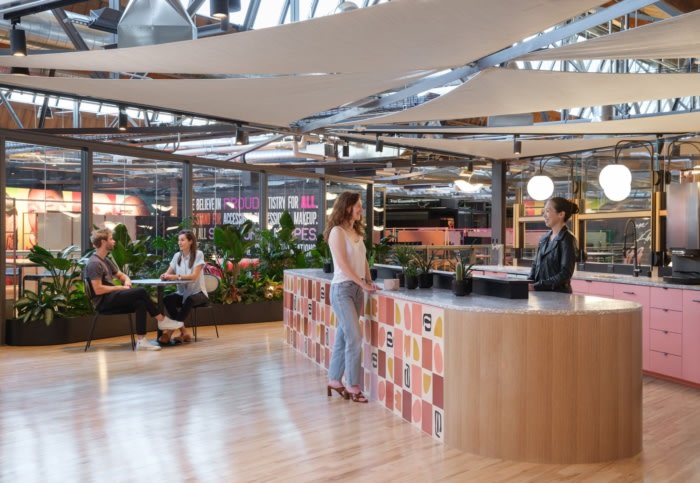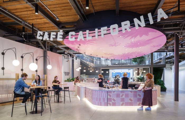 从洛杉矶一天中无处不在的阳光中汲取灵感,三个主题方向有助于在整个空间中设置每个迷你环境的情绪:平静、以个人为中心的区域由黎明时分的凉爽、柔和的色调代表;共享办公室和会议室等高能量的协作区域以中午明亮、清爽的色彩为代表;更柔和的公共区域供人们休息,如咖啡馆,反映在温暖、饱和的日落色调中。#公司办公楼装修风格#