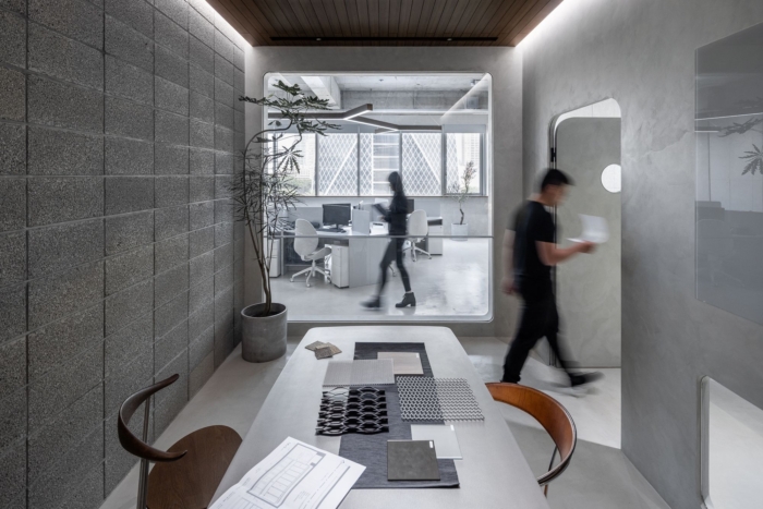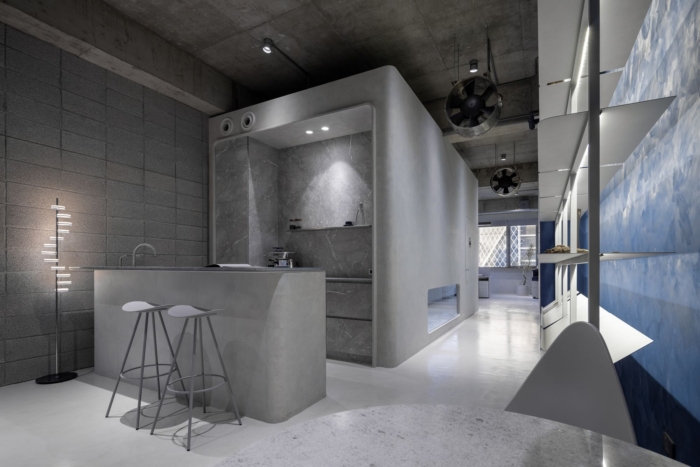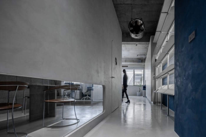 该设计将海洋、港口和船舱的跨领域概念融合到九个功能空间中,包括行政办公室。沿海工作区。窗吧,突出高雄港的印象。调色板以深海湾蓝和质朴的港口灰为主题色。它由工匠直接涂在原始墙壁和地板上,使用带有有机改性储层污泥 的墙面涂料。这种涂料可以有效减少浪费,实现可持续的环境目标。墙壁广泛采用草砖,这些草砖无需烧制即可生产,由河沙和颜料等材料制成,在高压下压缩。该方法符合环保生产的要求。此外,它们具有吸收水分的能力,从而防止了港口地区常见的潮湿。#办公室空间设计#