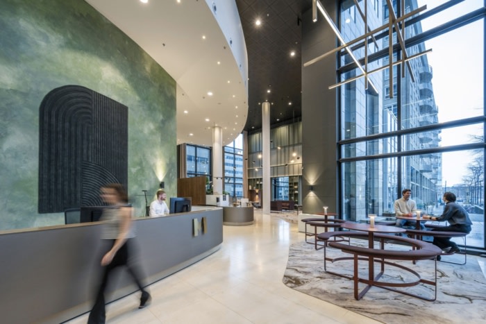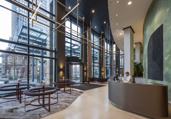 调色板温暖、自然、诱人。通过用现代设计的家具、柔软的材料和大量植物创造舒适的座位壁龛,为游客创造了亲密感。壮观的高墙设计进一步增强了这种温馨的氛围,与蒙德里安塔的建筑风格保持一致。各个区域邀请您快速开会、工作或放松。简而言之,创造了一个空间,在城市动态中创造了一种自然的宁静感。#办公楼室内装修公司#