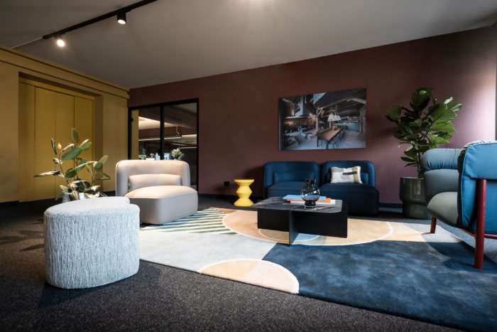 大堂是地板的中央空间,对称地将工作室分为两个区域。它占据了以前分为九个房间的空间,并通向一个大露台。通向露台的大堂区是一个休息室,来自意大利知名品牌的五颜六色的马赛克家具邀请游客在不断变化的座位岛中流连忘返。这里有正式会议区域,有舒适的沙发供咖啡休息,还有鸡尾酒椅,可以进行更私密的谈话。#办公室装修设计公司#