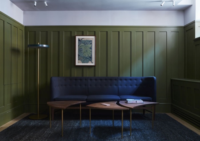 进入接待处时,迎接访客的是一个平静的空间;包括会议室、中央楼梯间和相邻的接待处。精心挑选的家具、配件和装饰暗示了建筑的工艺精神和与艺术的历史联系。深绿色的调色板向企业纺织品原型致敬,釉面瓷砖和彩绘镶板弥合了统一性和独特性之间的差距。#办公空间设计装修#